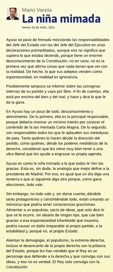 En Ayuso hay un poco de todo, desconocimiento y atrevimiento. De lo primero, ella es la principal responsable, porque debería mostrar un mínimo interés por conocer el contenido de la tan mentada Carta Magna. De lo segundo, son responsables todos los que le aplauden sus meteduras de pata. Tanto quiénes lo hacen desde la dirección del partido, como quiénes, desde los poderes mediáticos de la derecha, consideran que les viene muy bien tener a una ultra liberal que les ayude a engrasar su propia agenda.